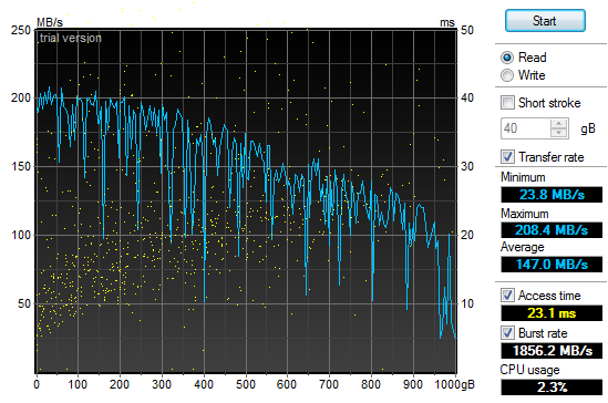 That may not look too impressive, but if you compare it to the same read throughput and access time graph for my old 2x1Tb 7200RPM SATA II HDD (Raid-0) configuration you will see a bit of a difference and why my grin is from ear to ear: