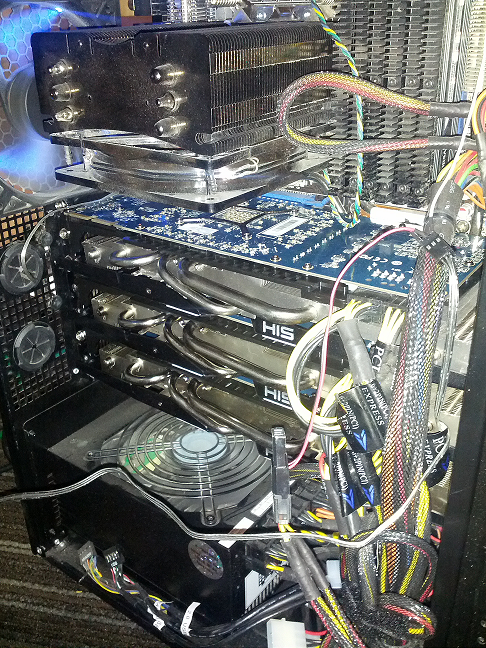 After my second coolant leak, it was time to remove my liquid cooling system.  It worked really well at keeping my system cool.  It was not as effective at keeping it dry.  It would not have been as annoying if I did not have an air cooled system running two dual GPU graphics cards and a Tesla super computer sitting under my desk at the same time.  My GPU password cracking box just hummed along without any overheating issues while my game system learned how to swim in low conductivity cooling solution.  So, I upgraded my case to an Antec 1200  to match my GPU cracker and replaced my pair of ATI 4895's with two ATI 5970's and I am back to the races.  The 3DMark numbers speak wonders about both the video cards and the difference between running Windows XP and Windows 7.
