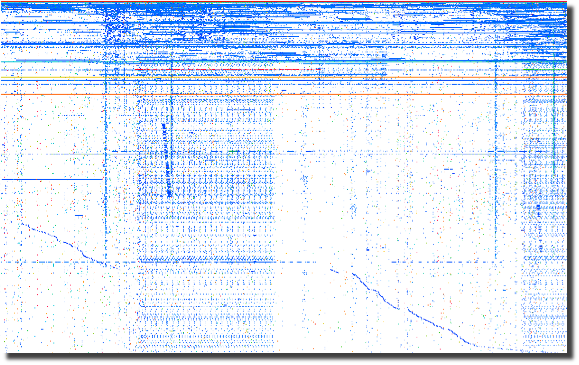 The y-axis is a list of all infected machines so each horizontal line is a single system (Host names clipped for anonymity). The color coding is based on the name of the malware with similar names having similar colors on the pallet. Analysis of the four solid verticals outside of the weekly schedule scan pattern (the consistent vertical pattern across all the plots) were four different outbreaks of a network scanner where signature updates were loaded across all systems and the IPS started detecting and blocking immediately. The analysis was done to evaluate the effectiveness of an A/V deployment. The initial impact was a clear determination that the A/V system needed some attention and over time, the analysis was used to re-enforce the value of enabling additional options in the A/V system. Ongoing analysis shows the tempo of malware detects and changes to the A/V environment.